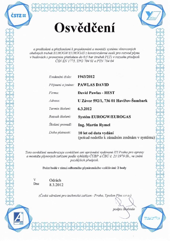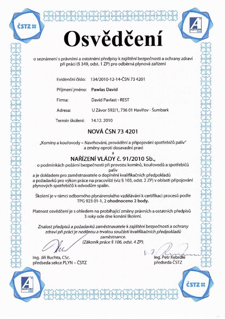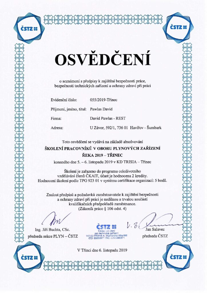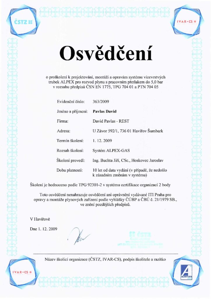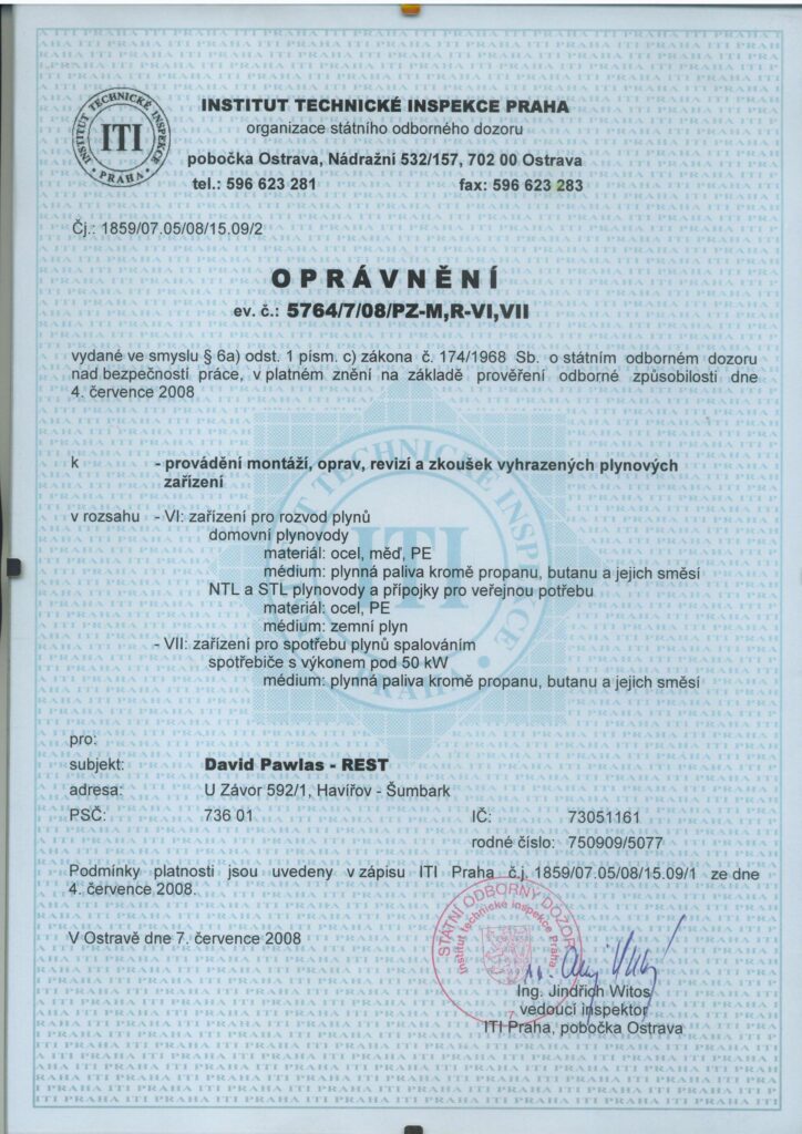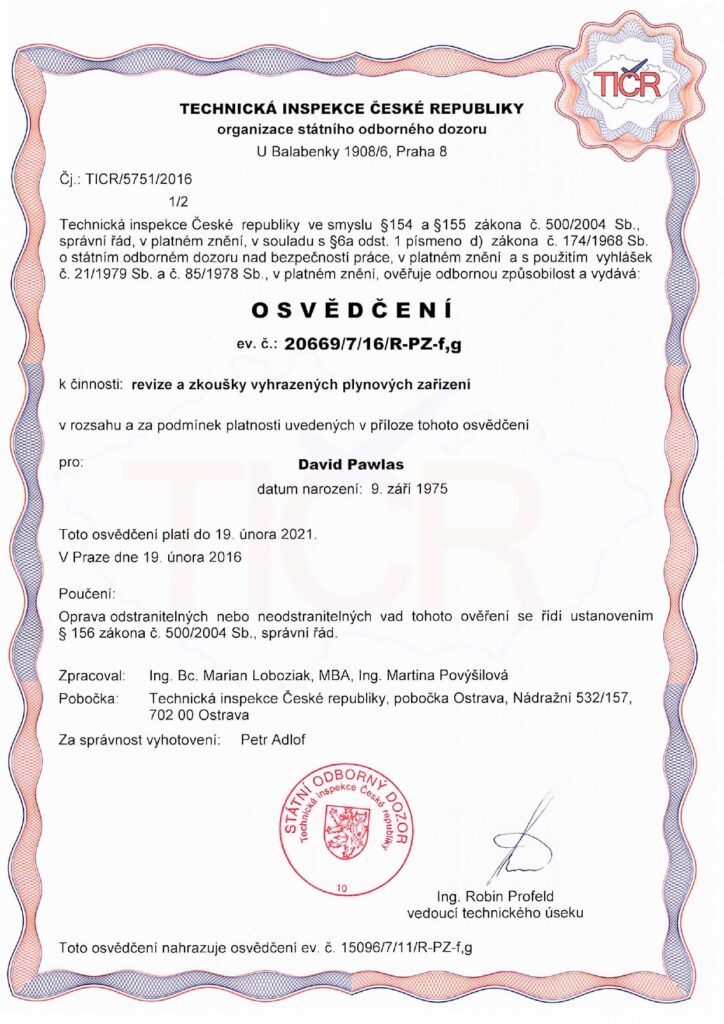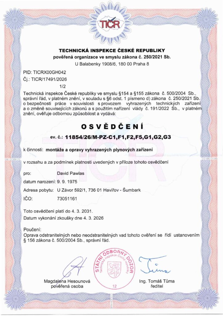 V této sekci najdete aktuální osvědčení, certifikáty a oprávnění, která potvrzují naši kvalifikaci a způsobilost k provádění specializovaných prací v oboru revize plynu, montáže plynových zařízení, ale také v oblasti voda–topení–plyn a stavebních úprav.