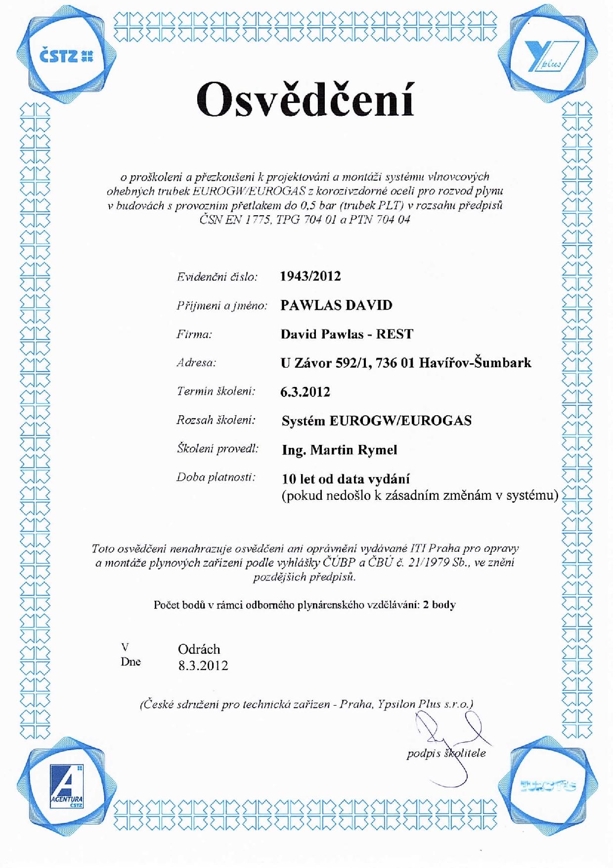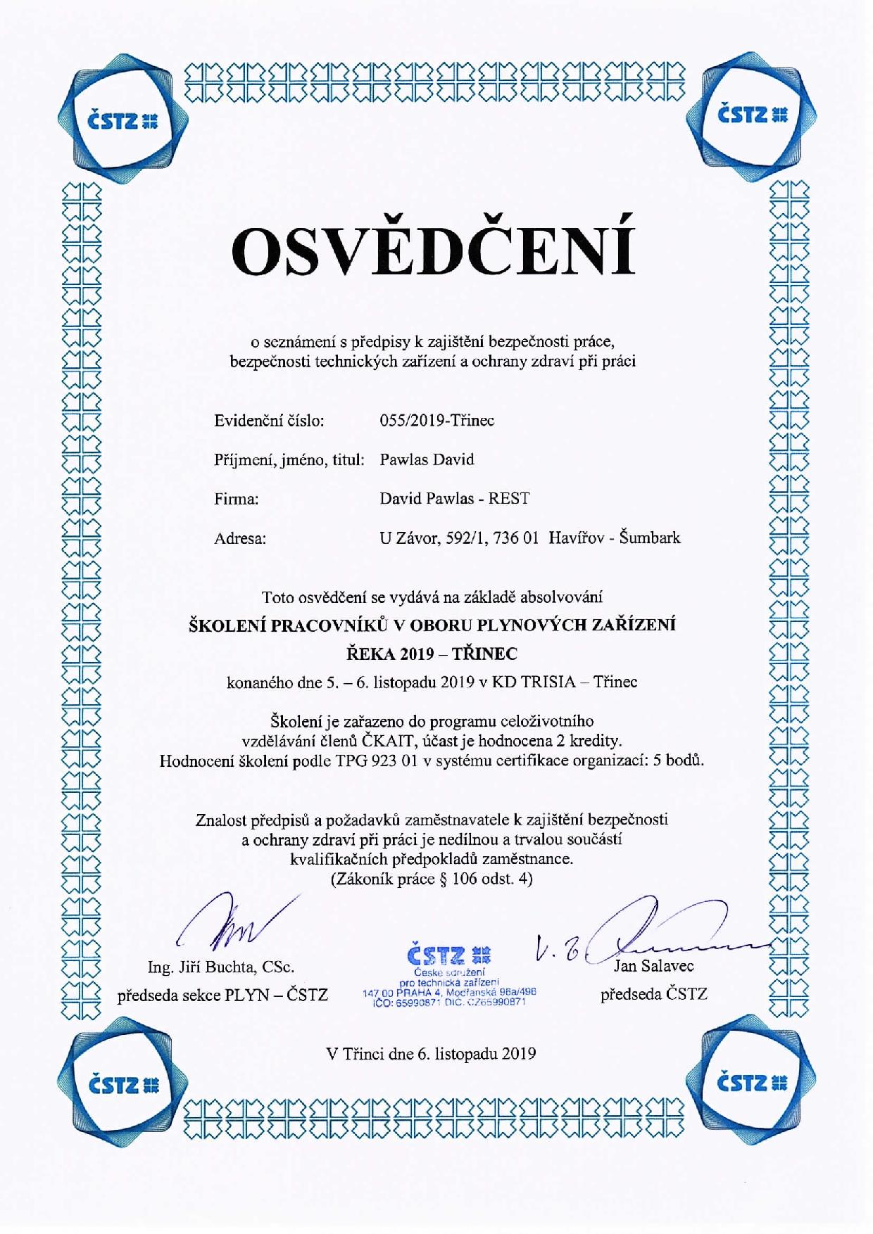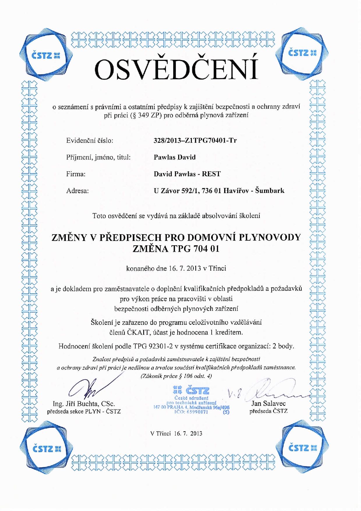 Osvědčení ČSTZ pro obor plynových zařízení